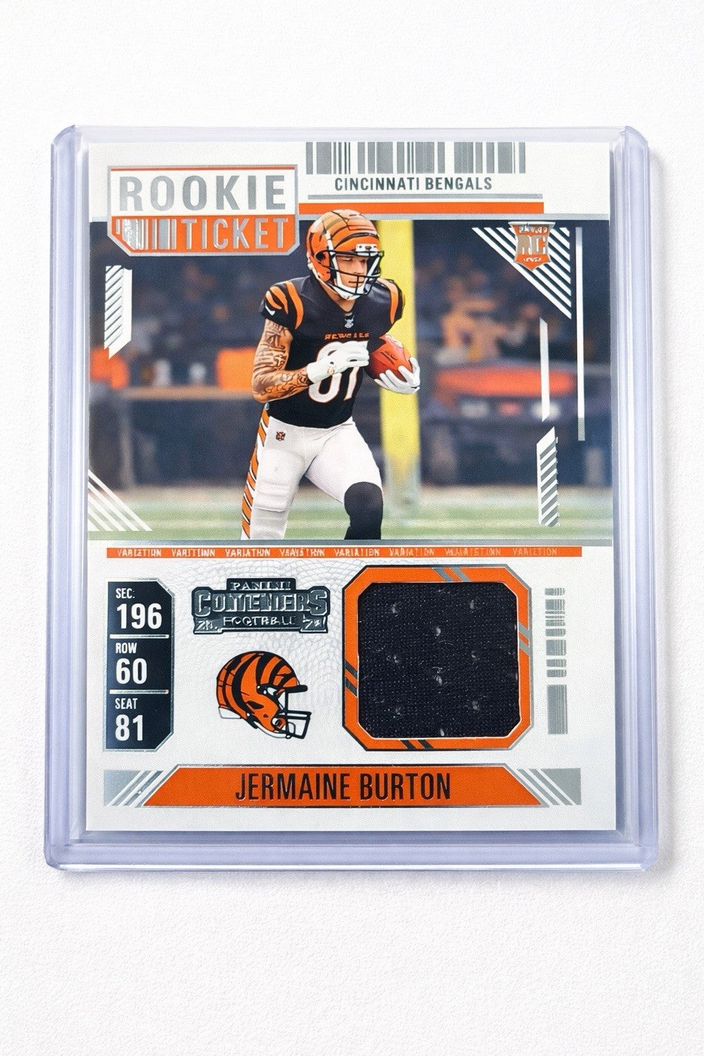 The product is a 2024 Panini Contenders Jermaine Burton Rookie Ticket Patch card featuring the Cincinnati Bengals. This sports trading card is an original piece manufactured by Panini, with a standard card size and made of card stock. The card includes a patch variation and is part of the National Football League (NFL) set for the 2024 season. It does not feature an autograph but is authenticated by Panini Authentic, making it a valuable collectible for football fans and trading card enthusiasts.