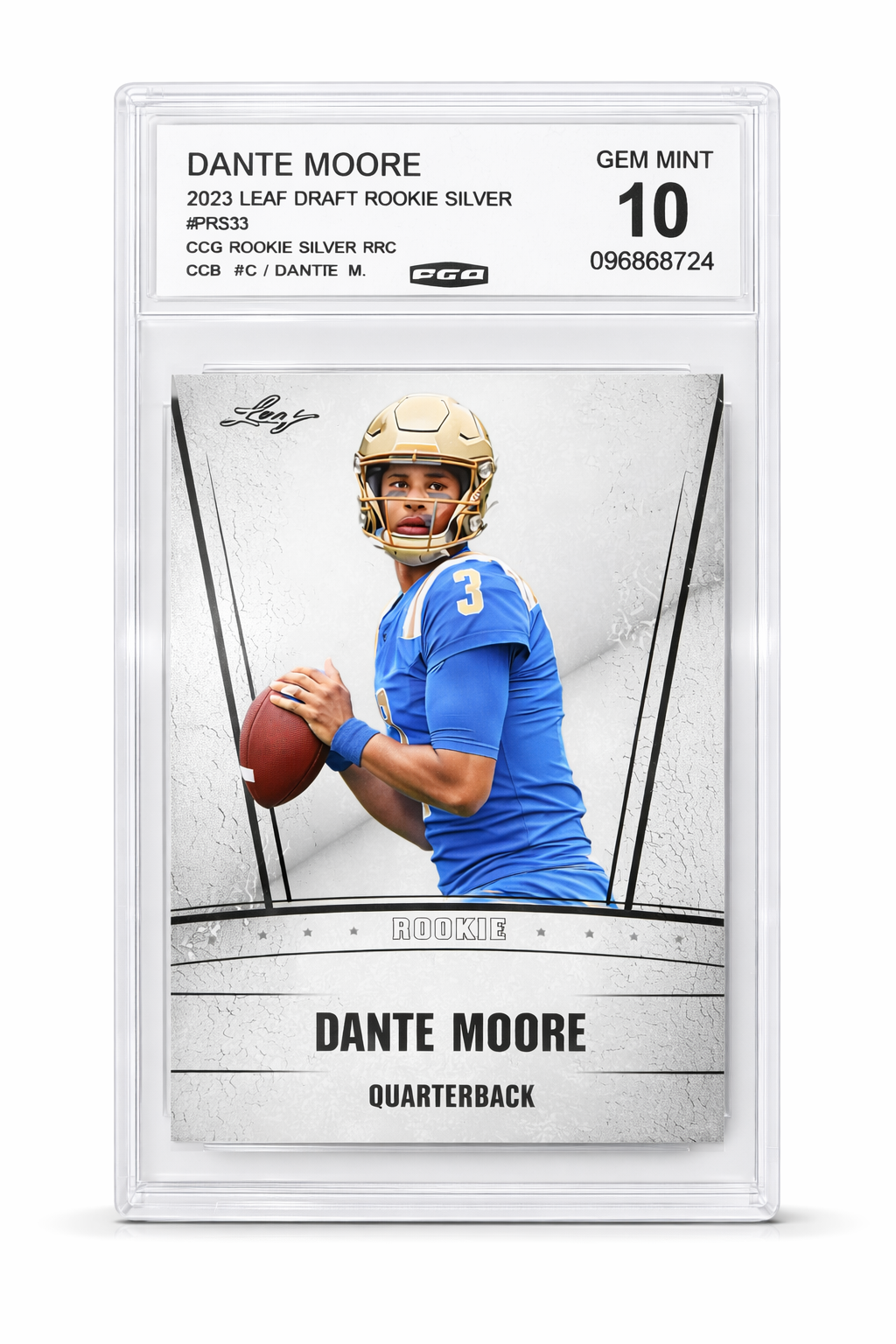 Secure a pristine graded rookie of highly touted quarterback Dante Moore with this 2023 Leaf Draft Rookie Silver PRS33, professionally graded PGI Gem Mint 10.