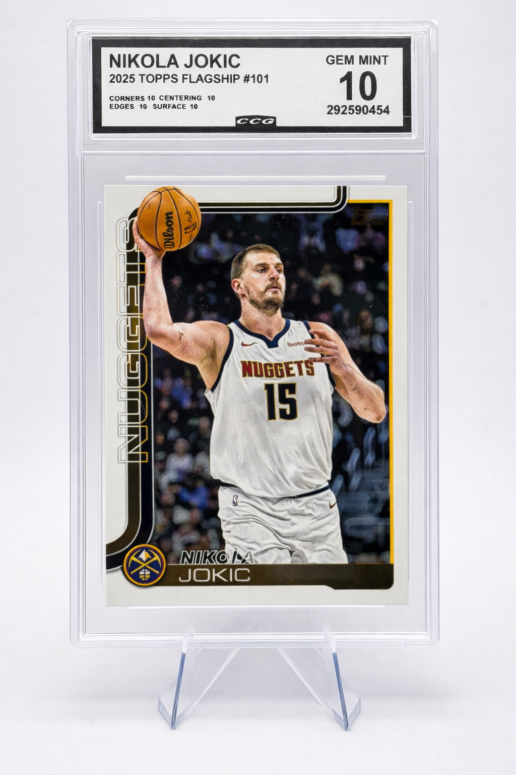 This 2025 Topps Flagship #101 features the Denver Nuggets superstar in classic action photography and has been professionally graded CCG 10 (Gem Mint) with perfect subgrades: